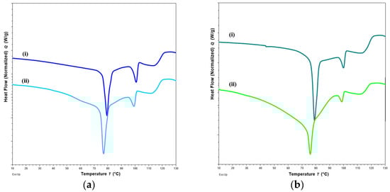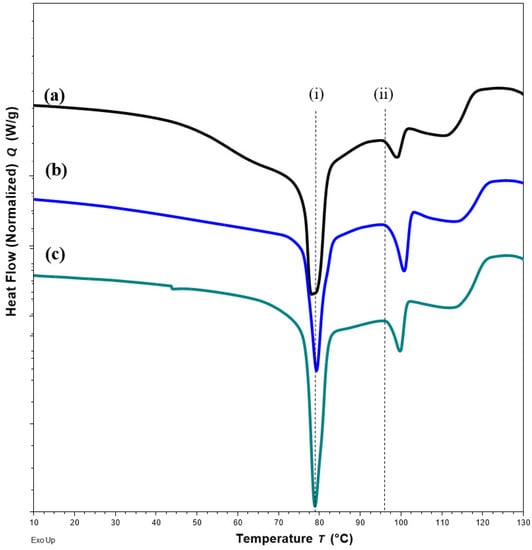 DSC thermograms for FTM-ECR samples (a) at Day 0; (b) after 3 months; (c) after 4 months of storage under relative humidity of 23%. All samples were stored at ambient temperature. Black dash lines show no shift in the peak (i) and the onset (ii) of the specified endotherms.