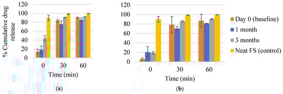 FTM-MCR and FTM-ECR at Day 0 showed the release of at least 80% of the respective drug loads within 60 min of incubation in simulated intestinal fluid (Figure 13a,b). Drug released at time 0 was more than two-fold higher for FTM-MCR (13.8 ± 5.4%) than for FTM-ECR (p = 0.0301, 6.0 ± 2.4%), with both samples showing significantly retarded initial drug release compared with neat FS (89.9 ± 6.1%). Storage for 3 months at ambient temperature and RH 57 to 79% increased the initial drug release from both FTM samples, with a greater change observed for FTM-MCR (p = 0.003, Figure 13a,b). Despite this increase, the stored FTM samples still showed a lower initial drug release than neat FS. Storage for 3 months at ambient temperature and RH 57 to 79% did not affect the cumulative drug release at 60 min, with both FTM samples releasing well above 80% of their respective drug loads (FTM-MCR, 92.6 ± 0.2%; FTM-ECR, 90.3 ± 1.1%).