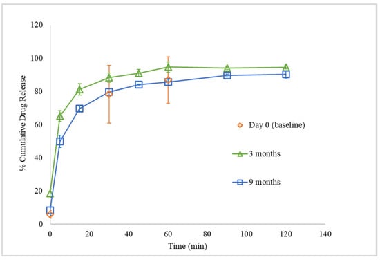 In vitro dissolution profiles of FTM-ECR samples on Day 0 and after storage for 3 months and 9 months at ambient temperature and relative humidity of 23%. Dissolution was performed over 120 min in 90 mL of PBS (pH 6.8) with Tween 80 0.1% w/v, at 37 °C and magnetic stirring at 100 rpm. Data are presented as mean ± SD (n = 3) of cumulative drug release expressed as a percent of drug load in the sample.
