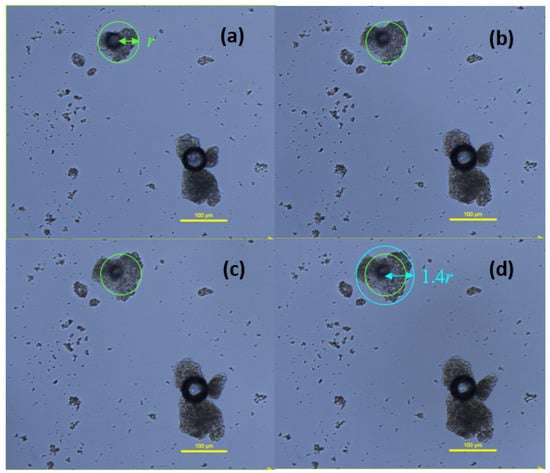 Images of FTM-ECR particles as a function of incubation time in phosphate buffered saline, pH 6.8, with 0.1% w/v Tween 80. Images were taken at (a) 2 min; (b) 15 min; (c) 30 min; (d) 60 min under a light microscope, magnification 400×; Nikon Eclipse Ti2. Green circle with radius r indicates diameter of particle at time 0 on the assumption the particle is a sphere, and blue circle with radius equivalent to 1.4 r shows final diameter of particle at 60 min.