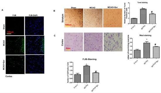 To examine the potential neuroprotective effects of quercetin, TUNEL staining and FJB staining were performed. In MCAO animals, both the cortex and the striatum exhibited a high number of FJB-positive cells (Figure 1A, * p < 0.05) and TUNEL-positive cells (Figure 1B, * p < 0.05), respectively, which were reduced by quercetin (# p < 0.05). Furthermore, the administration of quercetin led to a significant increase in the number of viable neurons in the cortex (Figure 1C, # p < 0.05 relative to MCAO, * p < 0.05) as shown by Nissl staining.