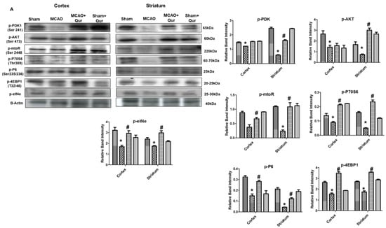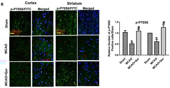 Excessive autophagy could exacerbate brain ischemia, and several research articles indicate that mTOR signaling exerts neuroprotective effects by inhibiting autophagy. To investigate this, mTOR and P70S6 protein levels were assessed by Western blotting. The phosphorylated form of these proteins was decreased in the MCAO group (Figure 3A, * p < 0.05) as compared to the sham. Moreover, quercetin was found to mitigate the MCAO effect on these protein levels (Figure 3, # p < 0.05). To further validate this, we performed an immunofluorescence analysis of p-P70S6, and similar results were demonstrated (Figure 3B, * p < 0.05) in quercetin-treated groups (Figure 3B, # p < 0.05). Phosphorylation of various downstream targets, including 40S ribosomal protein S6 (S6), is tightly regulated by the p70S6 kinase. This, in turn, regulates the activity of eukaryotic initiation factor 4E (eIF4E)-binding protein 1 (4EBP1), leading to subsequent effects on protein synthesis and cellular growth. The p-S6, p-eIF4E, p-4EBP1 levels were decreased in the MCAO group (Figure 3A, * p < 0.05) as compared to the sham. Moreover, quercetin was found to mitigate the p-S6, p-eIF4E, and p-4EBP1 protein levels.