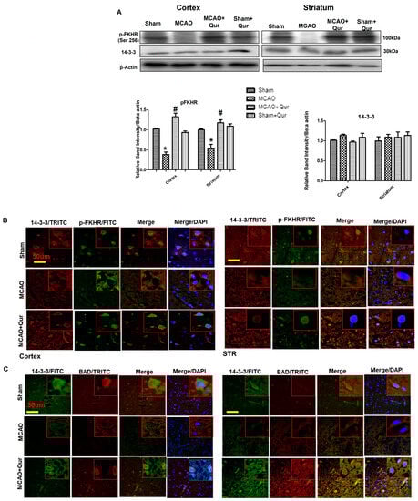 The phosphorylation of Bad and forkhead transcription factors (FKHR) by AKT effectively inhibits the apoptotic function of Bad and FKHR. This occurs through the formation of p-Bad and p-FKHR dimers with 14-3-3, preventing their interaction with Bcl-x(L) and Fas ligand, respectively, and preventing apoptosis [25,26]. To demonstrate the effects of quercetin, we conducted a Western blot analysis in the cortex and the striatum. Our findings showed that the levels of p-FKHR were significantly reduced in the MCAO group (Figure 4A, p < 0.01, # p < 0.05) compared to the sham group, while no significant effect on the 14-3-3 level was observed. However, quercetin treatment was observed to mitigate the reduction of p-FKHR protein levels (Figure 4A). To further examine the sequestering effects of 14-3-3 on p-Bad and p-FKHR, we performed a double immunofluorescence analysis, examining the co-localization of 14-3-3 with BAD (Figure 4C) and p-FKHR (Figure 4B). These results suggest that quercetin enhances the sequestering effect of 14-3-3.