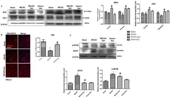 To assess the quercetin’s antioxidative properties, we evaluated Nrf2, HO-1, and thioredoxin (TRX) levels (Figure 5A). The Western blot revealed that there were alterations in Nrf2 and HO-1 in the MCAO group (Figure 5A). The administration of quercetin led to a significant elevation in the levels of Nrf2 and HO-1 (Figure 5A, # p < 0.05). To further support our findings, we performed immunofluorescence analysis of thioredoxin (TRX), a small-molecular-weight antioxidant protein, and similar results were demonstrated (Figure 5B, * p < 0.05, # p < 0.05). These results suggest that quercetin mitigated an MCAO-induced oxidative stress, at least in part, by activating Nrf2, which in turn regulates the production of downstream antioxidants. Additionally, activation of the NF-κB pathway plays a crucial role in inflammatory cascades. To investigate this further, a Western blot analysis was conducted to measure the protein levels of p-NF-κB and GFAP in the brain cortex (Figure 5C). The results demonstrated an increase in the expression of these proteins following MCAO (* p < 0.05).