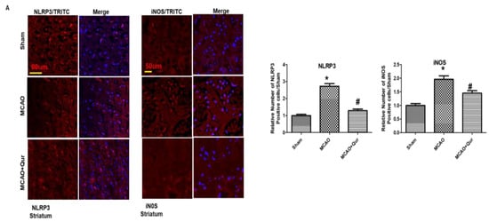 Consistent studies have demonstrated 8-oxo guanine as an oxidative stress marker [24]. To further validate this, we performed an immunofluorescence analysis for 8-oxo guanine (Figure 2). Our findings showed that the 8-oxo guanine expression was increased in MCAO (Figure 2, * p < 0.05) while quercetin reduced this rise in expression (# p < 0.05, Figure 2) both in the cortex and the striatum.