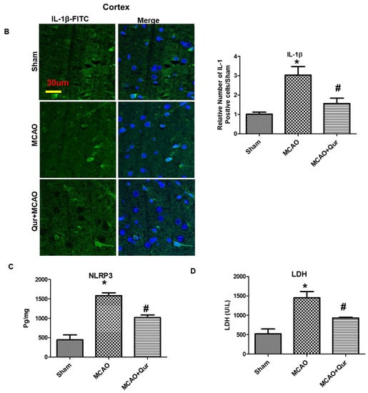To demonstrate the anti-pyroptosis effect of quercetin in MCAO, we determined the levels of NLRP3, IL-1β, and iNOS (Figure 6A,B) by immunostaining. We demonstrated here that NLRP3, IL-1β, and iNOS were upregulated in MCAO (* p < 0.05) while downregulated by quercetin (# p < 0.05). Further, we performed ELISA to determine the expression of NLRP3 in the cortex (Figure 6C). Compared with the sham group, the level of NLRP3 was upregulated in the MCAO group (* p < 0.05), which was reversed by quercetin treatment (# p < 0.05, Figure 6C). Moreover, the elevated LDH level demonstrated the compromised integrity of the cell membrane leading to pyroptosis and the release of mature IL-1β (Figure 6D).