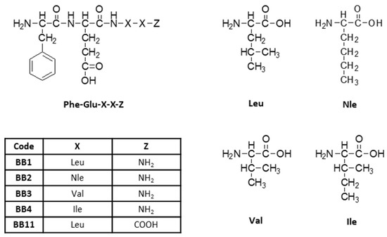Structures of the natural BB11 peptide and its analogs. Differences with the parent structure (BB11) are circled.