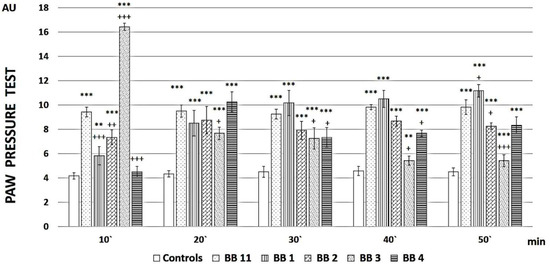 PPT of newly synthesized peptide analogs. Measurements have been performed every 10 min, starting from the 10th minute after peptide administration until the 50th minute. The results are presented in arbitrary units (AU) as mean values ± S.E.M. *** p < 0.001, ** p < 0.01 vs. controls; +++ p < 0.001, ++ p < 0.01, + p < 0.05 vs. BB11.