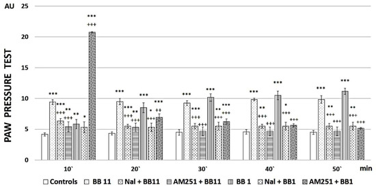 PPT of newly synthesized peptide analogs after Naloxone (Nal) or AM251 pre-treatment. Measurements have been performed every 10 min starting from the 10th minute after peptide administration until the 50th minute. The results are presented in arbitrary units (AU) as mean values ± S.E.M. *** p < 0.001, ** p < 0.01, * p < 0.05 vs. controls; Nal+BB11 and AM251+BB11 have been compared to BB11 +++ p < 0.001; Nal+BB1 and AM251+BB1 have been compared to BB1 +++ p < 0.001, ++ p < 0.01.