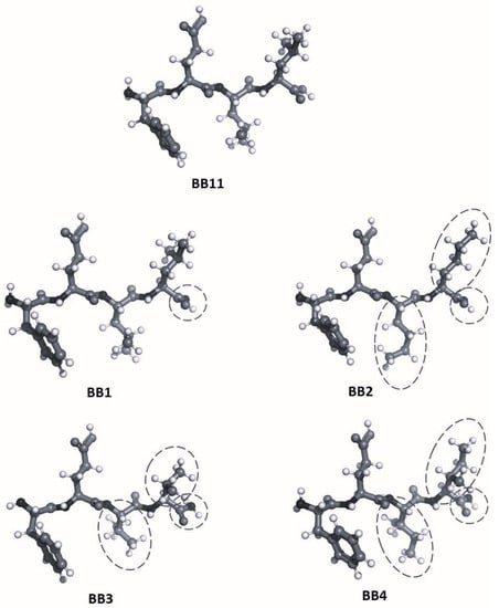 The 3D structures of FELL analogs are shown in Figure 4, and the calculated logp values for these structures are given in Table 2. The results shown in Table 2 present the natural BB11 as the most lipophilic one (logp = 1.54). Next is a group of three analogs—BB1, BB2, and BB4—all retaining the lipophilic nature, although to a lesser extent (logp values between 0.67, 0.80, and 0.82 for BB1, BB2, and BB4, respectively). Last at ambiphilic logp (close to 0, meaning equally dissolved in water and n-octanol) is the BB3 compound. Of the tested molecules, BB11 (the parent compound) would have the best distribution across biological tissues.
