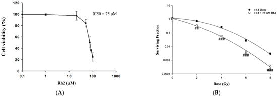 The cytotoxicity of Rh2 in CT26/luc cells and survival of CT26/luc cells treated with radiation alone or radiation combined with Rh2. (A) 1 × 104 CT26/luc cells per well were seeded into a 96-well plate for 24 h. The cells were then treated with various concentrations of Rh2 for 24 h. The cell viability of CT26/luc cells was evaluated with an alamarBlue assay. The cytotoxicity of Rh2 on CT26/luc cells was in a dose-dependent manner, and the IC50 was 75 µM. (B) Rh2 enhanced radiation-induced cytotoxicity in CT26/luc cells in synergism. CT26/luc cells were pretreated with or without 75 µM Rh2 for 24 h and then treated with various radiation doses (0, 2, 4, 6, 8 Gy). The surviving fraction was assayed with colony formation. Rh2 significantly enhanced radiation-induced cell killing compared with the radiation-alone group. ## p < 0.01; ### p < 0.001 for the surviving fraction with Rh2 compared with that without Rh2 under the same radiation dose.