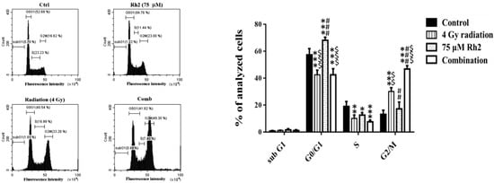 The cell cycle of CT26/luc cells treated with Rh2 and radiation was analyzed by flow cytometry. Rh2 significantly arrested the cell cycle at the G1 phase (Figure 2). CT26/luc cells treated with the combination of 75 µM Rh2 and 4 Gy radiation resulted in S-phase reduction and significantly increased the G2/M population.