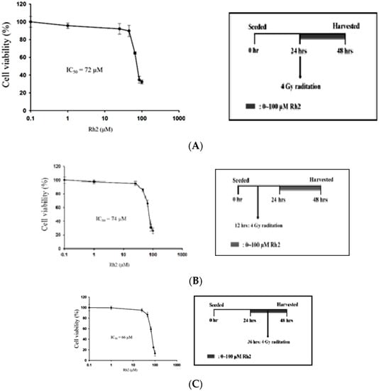 The efficacy of concurrent, post-treatment, and pretreatment in CT26/luc cells treated with Rh2 plus radiation was determined using the alamarBlue assay (Figure 3). The IC50 was 72 µM, 74 μM, and 66 μM for cells treated with Rh2 and 4 Gy radiation concurrently (Figure 3A), Rh2 after 4 Gy radiation (Figure 3B), and pretreatment with Rh2, followed by 4 Gy radiation (Figure 3C), respectively.