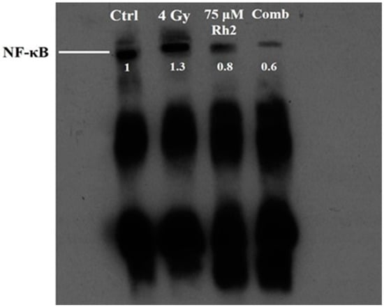 Changes in NF-κB activity caused by radiation, Rh2, and combination treatments were measured using a electrophoretic mobility shift assay (EMSA). The NF-κB DNA binding activity was increased in CT26/luc cells after 4 Gy irradiation, but suppressed by 75 μM Rh2, as shown in Figure 4.