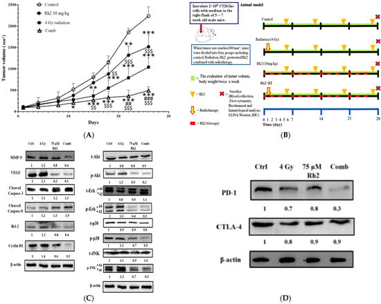 Rh2 enhances the therapeutic efficacy of radiation in CT26/luc tumor-bearing mice. (A) Flow chart of in vivo experiments. CT26/luc cells were subcutaneously implanted into the right flanks of the male mice. Mice were randomly divided into four groups (n = 6 per group): control, 4 Gy irradiation, Rh2 alone (10 mg/kg, gavage), and a combination of both (pretreated with 10 mg/kg Rh2 one day prior to 4 Gy irradiation). (B) Tumor volume was significantly inhibited in all treatment groups, especially in the combination group. (C) The expressions of tumor progression-related proteins, such as MMP-9, VEGF, Bcl-2, and Cyclin D1, were all increased in the radiation-alone group but were decreased in Rh2-alone and combination groups. The cleaved caspase-3 and -8 were increased in all treatment groups. Phosphorylated MAPK proteins, such as Akt, Erk, JNK, and p38, were all increased in the radiation-alone group but decreased in Rh2-alone and combination groups. (D) The splenocytes of the spleens were used to assay the expressions of CTLA-4 and PD-1. Both CTLA-4 and PD-1 could be slightly reduced by radiation and Rh2-alone treatments. Notably, PD-1 but not CTLA-4 was significantly reduced by the combination treatment. * p < 0.05, ** p < 0.01, and *** p < 0.001 for the treatment groups compared with that of the control. ## p <0.01 and ### p< 0.001 for Rh2-alone and combination groups compared with that of the radiation-alone group. $$ p < 0.01 and $$$ p < 0.001 for radiation-alone and combination groups compared with that of the Rh2-alone group.