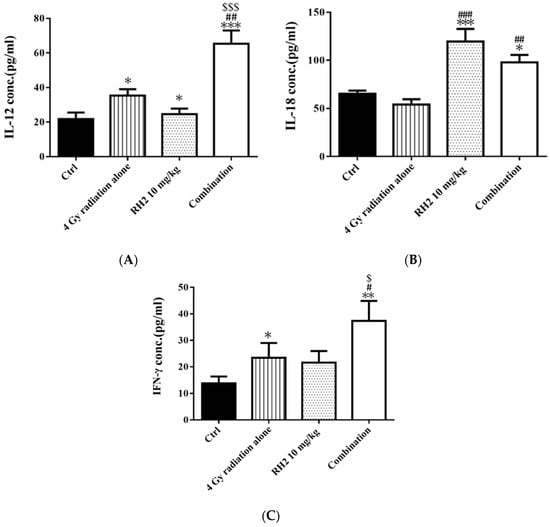 On day 26, the blood of mice was collected via cardiac puncture, and sera were used to determine the concentrations of interleukin-12 (IL-12), interleukin-18 (IL-18), and interferon-γ (INF-γ) by enzyme-linked immunosorbent assay (ELISA). Figure 7 shows that both IL-12 and IFN-γ were significantly increased in the radiation-alone and Rh2-alone groups and were most significantly increased in the combination group. The levels of IL-18 were increased in both the Rh2-alone and combination groups.