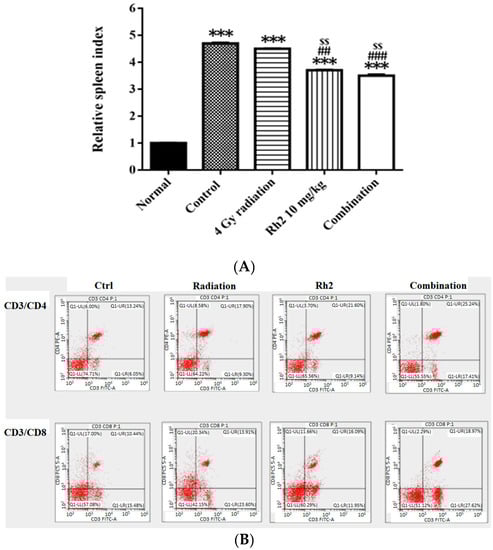 On day 26, mice were sacrificed, and spleens were removed and weighed. The relative spleen index was obtained by dividing the spleen weight by the body weight of the same mouse and normalized to 1 for the normal mice. The control and treatment groups were compared with those of the normal mice (Figure 8A). The results showed that the spleen indices of all groups were higher than those of the normal mice. Notably, the spleen indices in Rh2 alone and combination groups were both significantly decreased compared with those of the control and radiation alone groups. The lymphocyte subsets were determined by flow cytometry. The results showed that the frequencies of CD4+ and CD8+ T lymphocytes were increased in mice treated with Rh2 alone and combination groups, as shown in Figure 8B and Table 4. The control group had the lowest levels of CD4+ and CD8+ T lymphocytes (13.6 ± 0.8% and 11.5 ± 1.0%). Notably, the combination group had the highest levels of CD4+ and CD8+ T cells (24.8 ± 0.5% and 20.5 ± 2.5%).