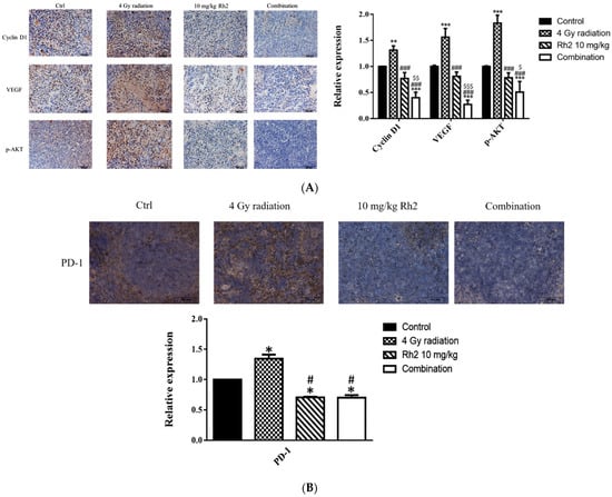 Immunohistochemical staining of proteins in tumors and PD-1 in spleens of mice sacrificed on day 26 post-treatment. (A) The expressions of Cyclin D1, VEGF, and p-AKT in tumors were increased by radiation alone but decreased by Rh2-alone and combination groups. Blue represents the nucleus, and brown represents the protein expression. Bars indicate 100 µm. (B) Expressions of PD-1 in Rh2-alone and combination groups were significantly decreased compared with those of the control and radiation-alone groups. * p < 0.05, ** p < 0.01, *** p < 0.001 for treatment groups compared with those of the control. # p < 0.05, ### p < 0.001 for Rh2 alone and combination groups compared with the radiation-alone group. $ p < 0.05, $$ p < 0.01, $$$ p < 0.001 for combination group compared with the Rh2-alone group.