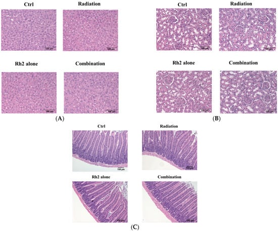 Histopathology of livers, kidneys, and small intestines of CT26/luc tumor-bearing mice treated with Rh2 alone, radiation alone, and combination of both. The sections were performed on day 26 post-treatment and then stained with hematoxylin and eosin. (A) livers; (B) kidneys; (C) small intestines. No pathological findings were observed among the control and treatment groups.