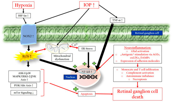 Our own studies in mice have demonstrated that an elevated IOP leads to endothelial damage in retinal blood vessels and the upregulation of nicotinamide adenine dinucleotide phosphate oxidase type 2 (NOX-2), a major enzyme responsible for generating ROS from oxygen (O2) in the form of superoxide (O2•−) [90,91]. Similar findings were observed in a rat model of glaucoma, where chronic high IOP-induced hypoperfusion of the ONH, axonal transport impairment, and excessive ROS production through the upregulation of NOX-2 occurred [92]. Hypoxia, which occurs during low oxygen concentrations, can also contribute to ROS production as the electron transport chain slows down, leading to an accumulation of reducing equivalents and subsequent O2•− production [92]. Hypoxia-inducible factor 1-alpha (HIF-1α) is upregulated in response to hypoxia in glaucoma patients and can further enhance NOX-2 and inducible nitric oxide synthase (iNOS) expression, resulting in ROS production [13,93,94,95,96]. ROS, in turn, can trigger the expression of HIF-1α, creating a feedback loop that amplifies inflammation and apoptosis [97,98]. Glial activation and the release of TNF-α follow, leading to the activation of the nuclear factor kappa-light-chain-enhancer of activated B cells (NF-kB), a transcription factor responsible for inflammation. This process amplifies glial activation, neuroinflammation, and ultimately apoptosis [14,80,81]. The activation of the apoptosis signal-regulating kinase 1 (ASK-1)/p38 mitogen-activated protein kinase (MAPK)/JNK/extracellular-signal-regulated kinase (ERK) axis by ROS can lead to caspase-3 activation and cellular membrane disassembly, promoting cell death [99,100]. Chronic exposure to ROS can activate the phosphoinositide 3-kinase (PI3K)/Akt axis while attenuating the mammalian target of rapamycin (mTOR) pathway, further stimulating the NF-kB and enhancing inflammatory events [101]. Additionally, excessive ROS disrupts glutamate metabolism, leading to the neurotoxic extracellular accumulation of glutamate, as dysfunctional glial cells fail to properly buffer the excess glutamate [16,102,103]. Moreover, oxidized metabolites, like advanced glycation end products (AGEs) and oxidized low-density lipoproteins (oxLDLs), can act as “antigenic” stimuli, promoting ROS production, NF-kB activity, glial activation, and apoptosis [15,16].