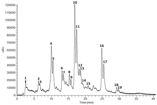 The composition of the T. capitata infusion was determined by HPLC-PDA-ESI-MSn. The results are shown in Figure 1 and Table 1.