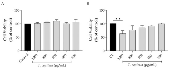 Effect of T. capitata extract on RAW 264.7 macrophages (A) and NIH/3T3 fibroblasts (B). Results show the mean ± standard error of the mean (SEM) of at least three independent experiments. Black bars represent untreated cells. Gray bars represent extract-treated cells. ** p < 0.01 after ANOVA followed by Dunnett’s multiple comparison test.