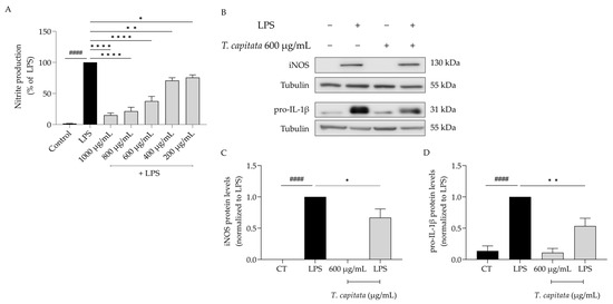 Considering the anti-inflammatory uses ascribed to infusions of T. capitata, we aimed to validate those effects on lipopolysaccharide (LPS)-stimulated macrophages. As expected, the presence of the Toll-like-4 agonist LPS for 24 h induced the release of nitric oxide, quantified as nitrites ([NO2−] = 43.66 ± 4.05 µM). The addition of the extract was able to decrease the amount of NO in the supernatant in all tested doses (IC50 = 558.6 µg/mL, Figure 3A). To unveil the mechanism of action associated with the anti-inflammatory effects of the extract, the dose of 600 µg/mL was selected, as it was the lowest dose with a more than 50% reduction in NO release. As shown in Figure 3B–D, the presence of LPS alone greatly increased the protein levels of both iNOS and the IL-1β pro-form. Interestingly, when T. capitata was added, the expression of both proteins decreased, suggesting that the infusion might modulate the NF-κB signaling pathway, a pro-inflammatory transcription factor controlling the expression of both mediators.