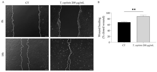 Effect of T. capitata extract on the wound healing of NIH/3T3 fibroblasts. Representative bright-field images of NIH/3T3 fibroblasts 0 h and 18 h (A) and percentage of closed wound (B) of NIH/3T3 fibroblasts 18h after scratch wound assay, in the presence (gray bar) or absence (black bar) of the extract. Results show the mean ± standard error of the mean (SEM) of at least three independent experiments. ** p < 0.01 when compared to CT after unpaired Student’s t-test. Scale bar: 100 µm.