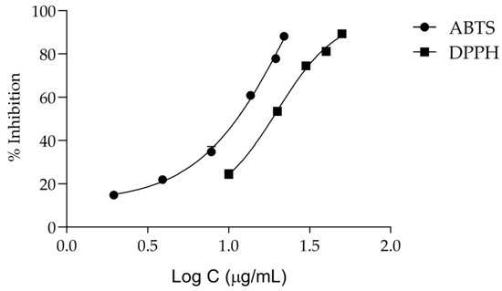 IC50 values were calculated from the plot of % DPPH inhibition against the logarithmic scale of the concentration (log C; µg/mL) using GraphPad Prism version 9.3.0 (GraphPad Software, San Diego, CA, USA). The results are also expressed as TE (Trolox-equivalents).