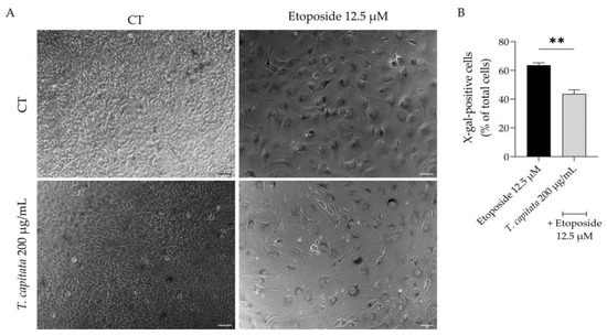 Effect of T. capitata extract on senescence-associated β-galactosidase activity. Representative bright-field images (A) and percentage of X-galactose-positive cells (B) of NIH/3T3 fibroblasts treated with etoposide (12.5 µM) for 24 h, and then left in culture medium alone (black bar) or in the presence of T. capitata extract (gray bar) for 72 h. Results show the mean ± standard error of the mean (SEM) of at least three independent experiments. ** p < 0.01 when compared to etoposide after an unpaired Student’s t-test. Scale bar: 100 µm.