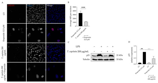 Effect of T. capitata extract on yH2AX (A,B) and p21 protein levels (C,D). Representative Z-stack images of NIH/3T3 fibroblasts treated with Etoposide (12.5 µM) for 24 h, and then left in culture medium alone (black bar) or in the presence of T. capitata extract (gray bar) for 72 h. yH2AX was stained with Alexa Fluor 564 and nuclei were counterstained with DAPI (A). Quantification of the yH2AX average mean fluorescence intensity (MFI) per nucleus (B). A minimum of 10 images were quantified in three independent experiments. *** p < 0.001 when compared to etoposide after a Mann–Whitney test. Scale bar: 10 µm. Representative Western blot images (C) and relative protein expression of p21 (D). Results show the mean ± standard error of the mean (SEM) of at least three independent experiments. ### p < 0.001 when compared to CT, ** p < 0.01 when compared to etoposide after ANOVA followed by Dunnett’s multiple comparison test.