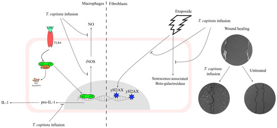 A T. capitata infusion exerts anti-inflammatory effects on macrophages by decreasing NO release, due to the inhibition of iNOS and pro-IL-1β protein levels. The extract of T. capitata is able to prevent the activity of senescence-associated β-galactosidase and the phosphorylation of histone H2AX. T. capitata is able to promote cell migration when compared to untreated cells.