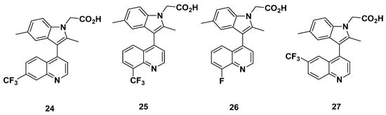 Birkinshaw et al. from AstraZeneca derived a series of indomethacin-based compounds in 2006 (Figure 5) [86]. In [3H]PGD2 displacement assays, the IC50 of most of the compounds (24–26) were suitably low at 5.4, 6.0, and 7.1 nM, respectively; the IC50 of compound 27, meanwhile, was high at 68 nM, indicating the low binding affinity of compound 27. Apart from in vivo potency studies, Birkinshaw et al. calculated the whole blood potency of the compounds, a marker of plasma protein binding. Except for the unmeasured compound 27, the whole blood potency was high at values ranging about 790 nM. This indicates the possibly low activity of the compound in blood. As could be predicted, the plasma protein binding was high at a value greater than 99.1 nM. The lipophilicity of all compounds, however, was acceptable at values from 0.5 to 1.8, measured as log D7.4. In vitro assessment of clearance yielded low values below 2.6 µL/min/106 cells in human hepatocytes (with the exception of compound 27, which again, could not be identified) but extremely divergent values in rat hepatocytes. The values ranged from <1 µL/min/106 cells for compound 26, 6.5 µL/min/106 cells for compound 25, and above 16 µL/min/106 cells for compounds 24 and 27. The discrepancy in values between human and rat cells may point to species-dependent clearance, but the consistently low clearance in human hepatocytes is promising, as it indicates an acceptable compound metabolism.