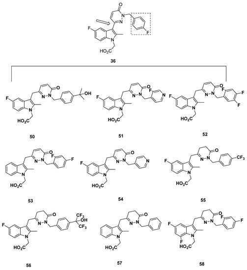 In a patent published in 2002, Pfizer disclosed compound 34 (Figure 7), which was reported to have 40-fold selectivity for GPR44 over DP1 [90]. Similarly, compound 35 (Figure 7) was reported to have a GPR44 pIC50 of 8.15.