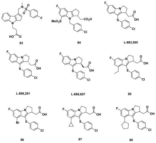 In 2011, Luker et al. from AstraZeneca developed a series of novel GPR44 antagonists based on a 3-thioaryl indole found through screening AstraZeneca compounds similar to indomethacin (Figure 6) [87].