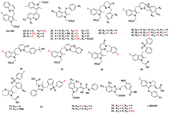 In this section, we evaluate a series of known analogues containing an isolated indole group not fused with other rings, with the exception of those already discussed as ramatroban (Figure 1) and ramatroban-based analogues [60]. These compounds could be considered as analogues of the well-characterized GPR44 antagonist indomethacin (Figure 1), a nonsteroidal anti-inflammatory drug (NSAID) commonly used to reduce fever, pain, stiffness, and swelling from inflammation [61]. Indomethacin is not described here due to its lack of a fluorine atom that may allow for 18F radiolabeling.
