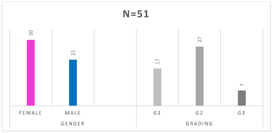 The mean age of patients at diagnosis of neuroendocrine tumors was 58.53 (SD = 12.44) years, with a normal distribution of the group structure (Figure 1). The studied group consisted of 30 women and 21 men. In 17 patients, the tumor was Grade 1(G1), in 27—G2, and in 7—G3 (Figure 2). In the histopathological analysis of the tumors (biopsy/operation), the mean proliferation index (Ki-67) was 9.82 ± 8.69%. The location of the primary tumor was unknown in 25 cases, and in 21 patients, the primary location was outside the gastrointestinal tract and pancreas, i.e., in the lungs (n = 10–19.6%), retroperitoneal space (n = 4–7.8%), ovaries (n = 3–5.9%), stomach (n = 2–3.9%), kidney (n = 1–2%) or were paragangliomas (n = 1–2%). These locations are referred in the discussion as “other” locations. The rest of cases were NEN G3 (pancreas, n = 4; small intestine, n = 1). The carcinoid syndrome occurred in 23 patients, 1 patient had metastatic paraganglioma, and 1 had a hormone-secreting NEN growth (GH-oma). Twenty-six patients (51%) had hormonally inactive tumors. Details of the groups and subgroups are presented in Table 2 and Table 3, and Figure 3.