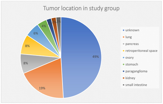 Neuroendocrine neoplasms (NENs) are a rare group of tumors with an estimated incidence of 350 per million. Their embryological precursor cells are derived from endo- and neuroectodermal tissues [1,2,3]. Despite shared embryological origin, neoplasms do not have identical secretory function, local growth rate, ability to metastasize, clinical course, or treatment prognosis [4,5]. In the European population, NENs are most commonly located in the small intestine, while in Asian countries, the large intestine location predominates. Tumors of gastrointestinal location (stomach, duodenum, small and large intestine), as well as ones derived from the pancreas, are known as “GEP-NENs”. However, if tumors develop virtually in any other part of the body, then they are called “non-GEP-NENs” [6,7,8,9,10]. In 20% of diagnosed cases, the primary tumor location remains unknown. In such cases, the disease is diagnosed solely based on biopsies of metastatic lesions or imaging studies and clinical features [11,12,13]. It seems that the primary starting points of these tumors are the gastrointestinal tract, and the primary lesion itself is simply elusive in a standard diagnostic procedure. This group is usually identified as non-standard in most studies and analyses.