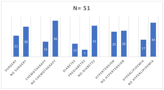 In the study group, the primary tumor staging or other medical aspects prevented surgical treatment in 30 (58.82%) patients. Chemotherapy was administered to 15 (29.41%) patients prior to initiating radioisotope treatment. Initially, about 40% of patients had pre-diabetes or diabetes, 50% had hypertension, and 33% had hyperlipidemia (Figure 4). The majority of patients received monthly injections of lanreotide (36 received Somatuline Autogel® 120 mg and 15 received Sandostatin LAR®/Okteva® 30 mg). Only four patients had a change in the somatostatin analogue used during treatment (three from octreotide to lanreotide, one from lanreotide to octreotide). At the time of qualification, 49 (89.1%) patients were found to have disseminated cancer, while 2 (1.9%) showed increased local and regional progression (Figure 5).