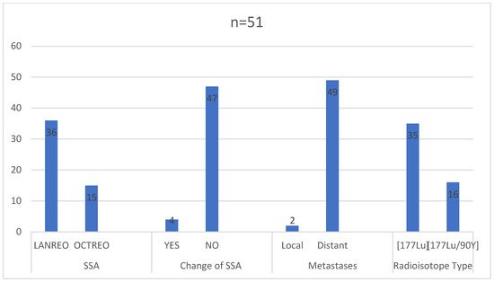 Out of the total, 35 patients (68.63%) underwent treatment involving 177-Lutetium (7.4 GBq). This treatment was administered intravenously (i.v.) in four cycles with intervals of 10 to 12 weeks. On the other hand, 16 patients (31.37%) underwent tandem therapy with a combination of 177-Lutetium and 90-Yttrium in equal activities (1.85 GBq + 1.85 GBq). Similar to the first group, the tandem therapy was delivered through intravenous (i.v.) administration in four cycles with 10 to 12 weeks between each administration.