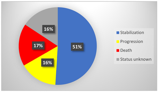 Overall, the medium observation time of the study group (n = 51) after RLT was 14 months (IQR = 18 months). Stabilization of the neoplastic disease was confirmed in 26 individuals (51%), with the median observation time (OT) in this subgroup being 15 months (IQR = 17 months). Progression was confirmed in eight patients (16%), with the median progression free survival time being 20 months (IQR = 16 months). Death was confirmed in nine patients (17%)—their median time of overall survival (OS) was 8 months (IQR = 14 months). In eight patients, the accurate status of the disease was unknown due to lack of contact (neither with patients nor with their families). Detailed data of treatment outcomes are presented in Table 5 and Figure 6.
