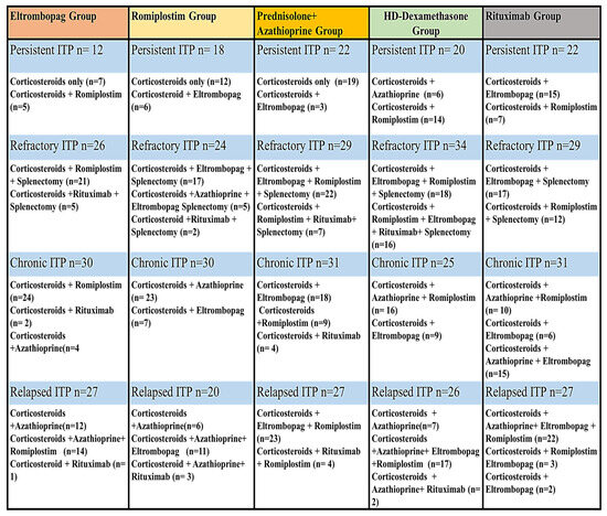 ITP is classified into phases based on symptoms’ duration, treatment response, and relapse after remission. Acute ITP represents the confirmed diagnosed phase, lasting about three months [10]. Some patients with ITP persist despite early treatment and progress to persistent ITP, lasting between 3 and 12 months. Chronic ITP is defined as the presence of ITP symptoms for over one year [11]. The American Society of Hematology guidelines identified a group of patients as having refractory ITP if they matched two criteria: (1) they failed splenectomy and (2) they remained to have serious ITP or a bleeding risk necessitating therapy [1,12]. Recent studies also defined the refractory term as a lack of response to one or more conventional therapies (including rituximab and thrombopoietin Receptor Agonists [13,14,15]. Relapsed ITP was described in the patients who represented recurrent thrombocytopenia after normalization of platelets while patients were both on and off-label treatment, with the greatest response to that line recorded before relapse and subsequent requiring re-therapy [16]. Corticosteroids, particularly high-dose Dexamethasone (HD-DXM) or Prednisolone (PSL), are commonly recommended for newly diagnosed ITP [17]. However, despite an initial response in 60–70% of patients, most responders experience relapse, with only 15–40% achieving a durable sustained response [18]. Second-line treatment options such as Rituximab (RTX), Azathioprine (AZA), and TPO-RAs like Eltrombopag (ELTRO) or Romiplostim (ROMP) are recommended by the American Society of Hematology guidelines for treating corticosteroid-resistant or intolerant ITP [3,17,19]. Nowadays, splenectomy is delayed and only considered following TPO-RAs and/or rituximab failure. According to the most recent American Society of Hematology (ASH) guidelines and an updated international consensus report, splenectomy is a third-line treatment option [20,21]. However, comparative data on the optimal therapeutic regimens for each phase of primary ITP are lacking.