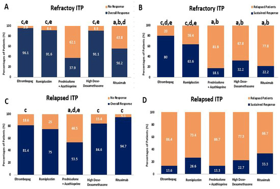 Comparison between Eltrombopag, Romiplostim, Prednisolone + Azathioprine, high-dose Dexamethasone, and Rituximab according to percentages of patients’ response, (A) the percentages of patients who achieved the overall response rate (ORR) and no response (NR) in refractory ITP patients, (B) the percentages of patients who achieved the sustained response (SR) and Relapse in refractory ITP patients, (C) the percentages of patients who achieved the overall response rate (ORR) and no response (NR) in relapsed ITP. (D) The percentages of patients who achieved the sustained response (SR) and Relapse in relapsed ITP. a Significantly different from the Eltrombopag regimen at p-value < 0.05. b Significantly different from the Romiplostim regimen at p-value < 0.05. c Significantly different from the Prednisolone + Azathioprine regimen at p-value < 0.05. d Significantly different from the high-dose Dexamethasone regimen at p-value < 0.05. e Significantly different from the Rituximab regimen at p-value < 0.05.