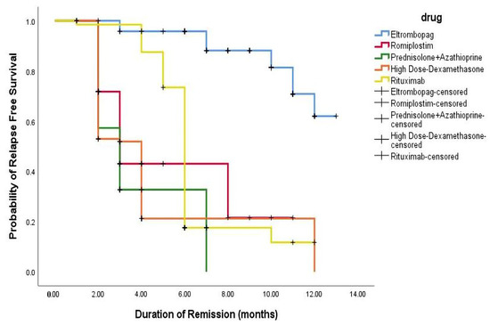 Descriptive statistics were used to summarize the data stratified by treatment regimens (Eltrombopag, Romiplostim, Prednisolone + Azathioprine, high-dose Dexamethasone, and Rituximab). Chi-square analyses were used to compare categorical variables between each group and the others, while t-tests were used to compare continuous variables. Mann–Whitney U tests were used to compare non-normally distributed variables. Relapse-free survival analysis was performed using the Kaplan–Meier method. General linear correlation was used to examine the relationship between post-therapeutic regimens’ platelet counts and age, gender, or ITP phases for the five regimens in each phase of ITP. All statistical analyses were conducted using SPSS version 21.0 for Windows (SPSS, Chicago, IL, USA).