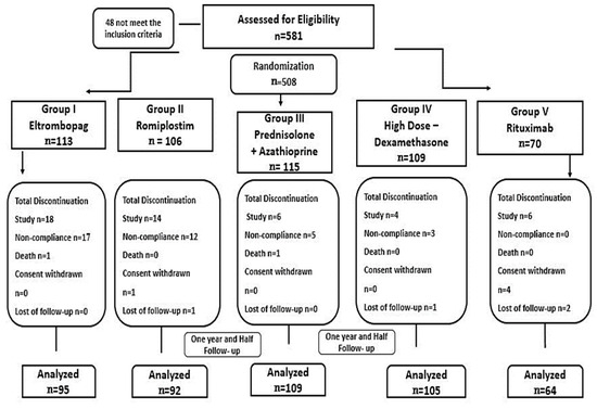 Four hundred sixty-seven patients with confirmed diagnosed ITP were randomly assigned to one of the five treatment groups using a closed-envelope randomization method. Stratified randomization was achieved during patients’ collection under the inclusion and exclusion criteria specification. The patients were selected from a pool of 581 patients who met the specific inclusion criteria. Patients who discontinued therapy earlier than six months due to switching to another regimen or non-compliance were excluded from the study (Figure 5).