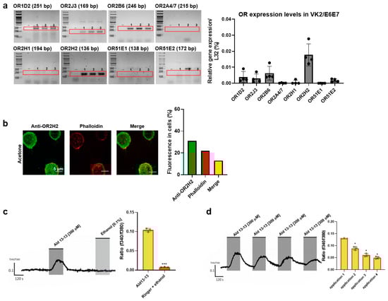 OR2H2-mediated increase in intracellular Ca2+ level in VK2/E6E7 cells: (a) Expression of OR2H2 and other ORs in VK2/E6E7 cells determined by RT-PCR. “-” represents a negative control without reverse transcriptase during cDNA synthesis. Experiments were conducted in triplicates, denoted as 1, 2, and 3 in the gel images. (b) OR2H2 expression in VK2/E6E7 cells observed through immunocytochemical staining, using anti-OR2H2 antibody (green). Actin was stained with phalloidin (red). Scale bars represent 5 µm. Fluorescence quantification is shown in the right panel. (c) Intracellular Ca2+ concentration after aldehyde 13-13 (300 µM) stimulation in VK2/E6E7 cells. The application time (120 s) is indicated by the grey square. Solvent ethanol (0.1%) was applied to assess potential solvent-mediated reactions. (d) Verification of Ca2+ desensitization with repeated aldehyde 13-13 (300 µM) stimulation. Cells were repetitively stimulated with aldehyde 13-13 (300 µM) for two minutes, while control cells received a vehicle treatment (ethanol in Ringer’s solution) repeatedly for the same duration. Ratiometric calcium imaging and normalized mean values from all ratio graphs are presented. Experiments were carried out in either three or four replicates. Ald 13-13 signifies aldehyde 13-13. Two-tailed unpaired t-tests were employed for either multiple or two-group comparisons. Significance markers: *, p < 0.05; ***, p < 0.001.