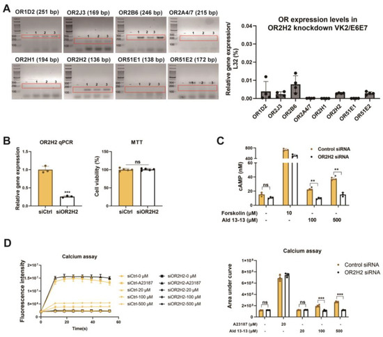 Aldehyde 13-13 increases intracellular Ca2+ and cAMP levels in VK2/E6E7 cells, but not in OR2H2 knockdown VK2/E6E7 cells: (A) OR expressions in VK2/E6E7 cells post-OR2H2 gene knock-down via OR2H2 siRNA. “-” is a negative control without reverse transcriptase during cDNA synthesis. Experiments were performed in triplicates, as indicated 1, 2, and 3 in the gel images. (B) OR2H2 expression in VK2/E6E7 cells measured by qPCR (left panel) and cell viability evaluated by MTT assays (right panel) post siRNA transfection. (C) Intracellular cAMP and (D) Ca2+ concentration post-aldehyde 13-13 (100, 500, 1000 µM) stimulation in control siRNA-treated VK2/E6E7 cells and OR2H2 siRNA-treated VK2/E6E7 cells. Experiments were conducted in three to five replicates. Ald 13-13 denotes aldehyde 13-13. Forskolin represents a cAMP agonist; A23187 is a Ca2+ agonist. Two-tailed unpaired t-tests were used for multiple or two-group comparisons. Significance markers: *, p < 0.05; **, p < 0.01; ***, p < 0.001.