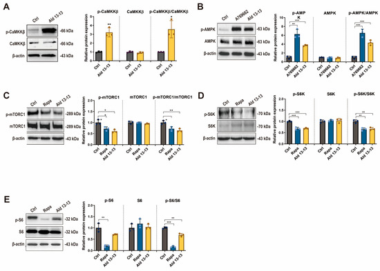 AMPK plays a pivotal role in regulating cellular energy metabolism and homeostasis [18]. Its activation is considered a prospective therapeutic target for metabolic disorders [19] and aging [20]. AMPK exhibits diverse biological functions, predominantly activating the autophagy pathway through the phosphorylation inhibition of mTORC1 [21]. Given that S6K and S6 are downstream signaling components of mTORC1, their phosphorylation was also examined. Immunoblotting revealed a significant decrease in phosphorylation levels of mTORC1, S6K, and S6 (a target of S6K) in VK2/E6E7 cells post aldehyde 13-13 treatment (Figure 4C–E and Figure S3c–e). The ratios of phosphorylated-to-total mTOR, S6K, and S6 were notably diminished. Consequently, OR2H2 activation by aldehyde 13-13 stimulates the CaMKKß–AMPK–mTORC1 signaling pathway.