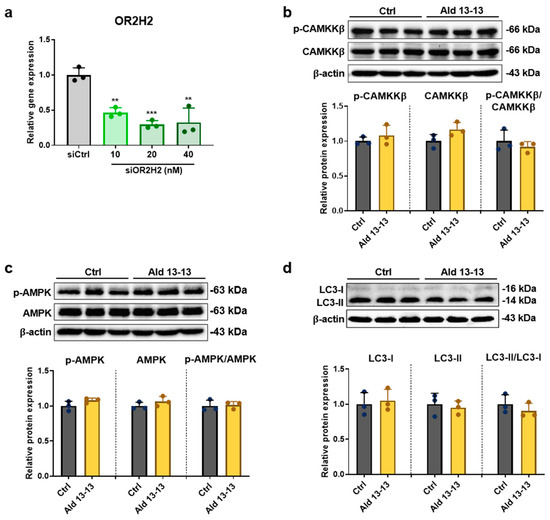Aldehyde 13-13’s influence on the CAMKKβ–AMPK–autophagy pathway is negated following OR2H2 gene knockdown: (a) OR2H2 gene knockdown analysis in cells transfected with control (scrambled) and varying concentrations of OR2H2 siRNA; (b) Immunoblot results for phospho-CaMKK-ß, CaMKK-ß, and p-CaMKK-ß/CaMKK-ß ratio; (c) phospho-AMPK, AMPK, and p-AMPK/AMPK ratio; (d) LC3I, LC3II, and LC3II/LC3I ratio. Experiments were performed in triplicate. Ctrl, control (0.1% DMSO); Ald 13-13, aldehyde 13-13 (500 µM). Data are shown as mean ± SD. Two-tailed unpaired t-test was used for multiple or two-group comparisons. **, p < 0.01; ***, p < 0.001.