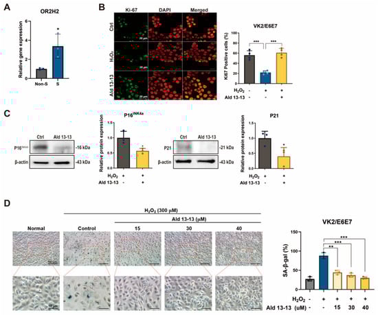 To delve deeper into OR2H2’s influence on cellular aging and senescence, we observed the repercussions of aldehyde 13-13 on senescent VK2/E6E7 cells. These cells underwent senescence induction by oxidative stress (H2O2, 300 μM) for 3 days, with a preceding incubation with aldehyde 13-13 to discern its anti-senescent capabilities. Notably, OR2H2 expression tripled in senescent cells compared to their non-senescent counterparts (Figure 7A), implying heightened sensitivity of senescent VK2/E6E7 cells to aldehyde 13-13.